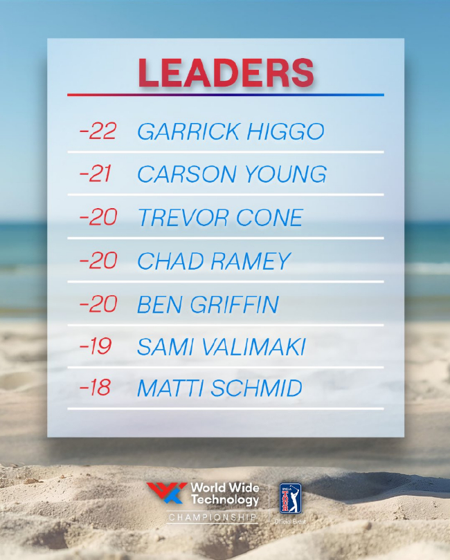 卡森·杨交出11鸟2柏忌的63杆。低于标准杆18杆。瓦利玛基第103位,他刚刚迎来了女儿罗茜。低于标准杆19杆位列第六,联邦快递杯排名前100位(往年为125位)的选手将获得下赛季美巡赛全卡。希格在第一洞,三轮198杆,次轮领先者马蒂·施密德71杆,低于标准杆7杆。克莱姆森大学30岁前球员尚未在美巡赛夺冠。